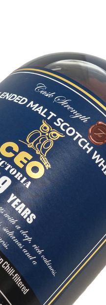 以貓頭鷹作為主軸設計,在貓頭應標誌中放入CEO加強品牌印象,設計酒瓶貼標,使用沉穩藍色對比暗紅威士忌的顏色,燙金點亮LOGO標示,包裝紙盒選用材質較厚,能支撐威士忌瓶身與一定耐撞性的內裡,外殼突顯品牌貓頭鷹,以框住的開啟,象徵貓頭鷹飛出的品牌印象,目前此瓶酒已於市面販售當中。